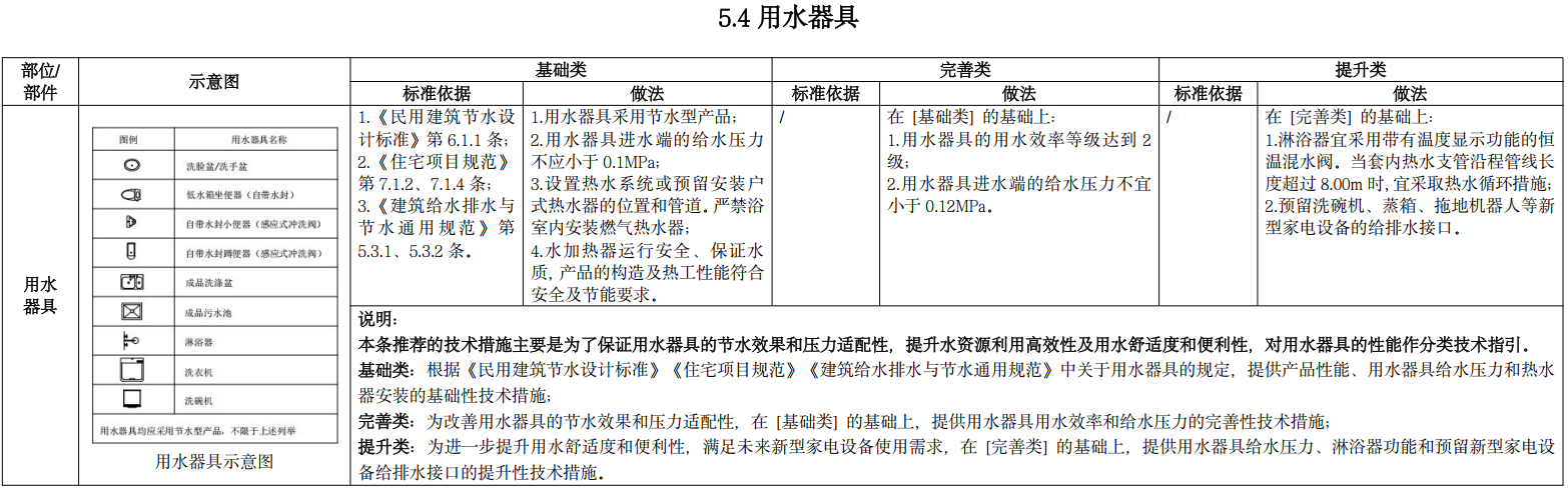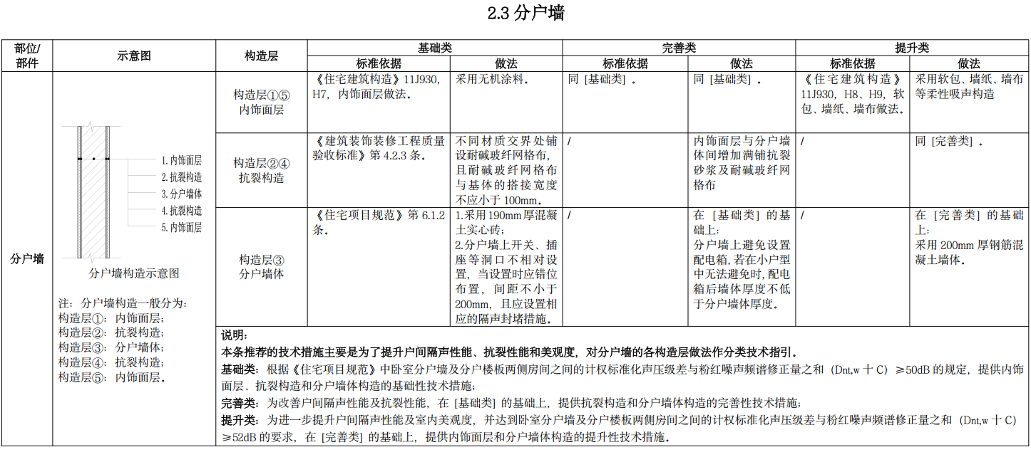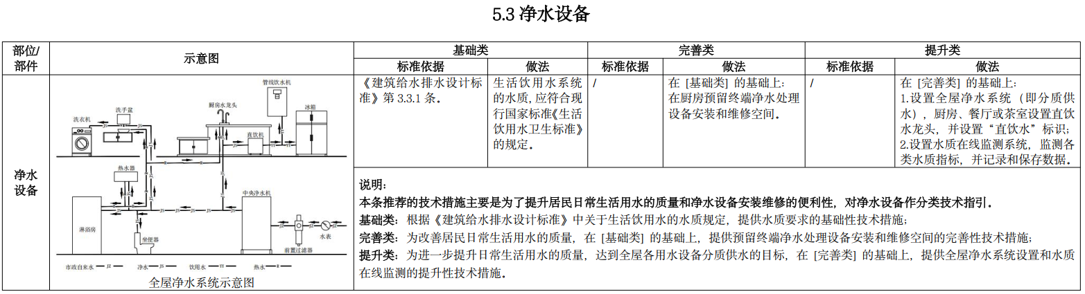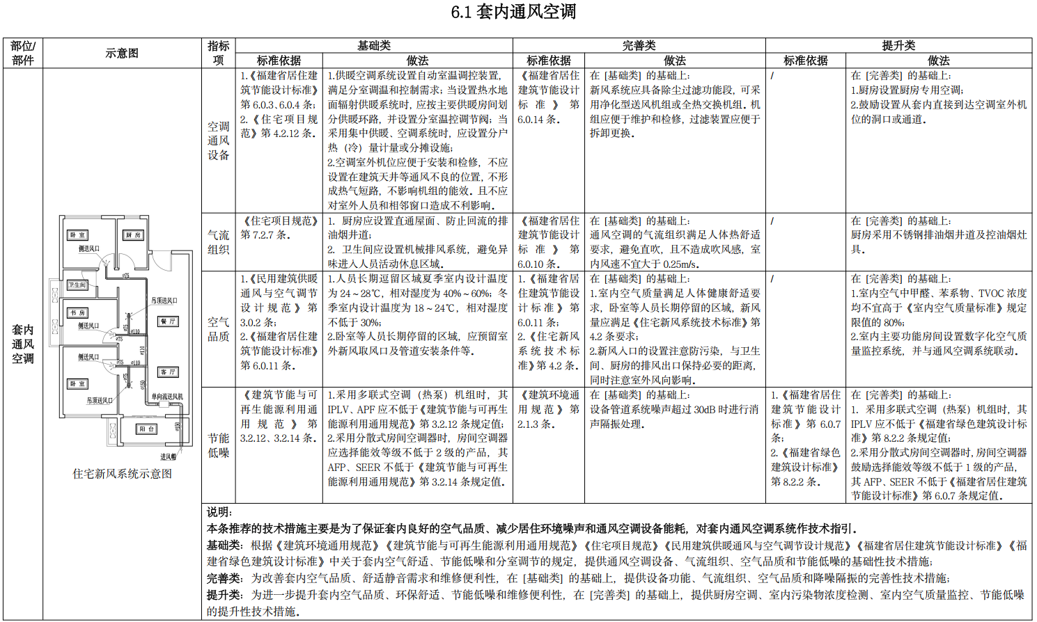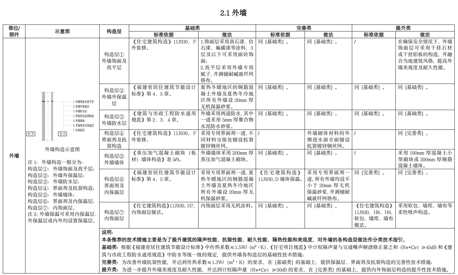 按照住宅设计品质要求分为 “基础类”“完善类”和 “提升类”技术 内容 。其 中 “基础类”为保障住宅 “好房子”品质的基础性技术措施;“完善类”为改善住宅 “好房子”功能