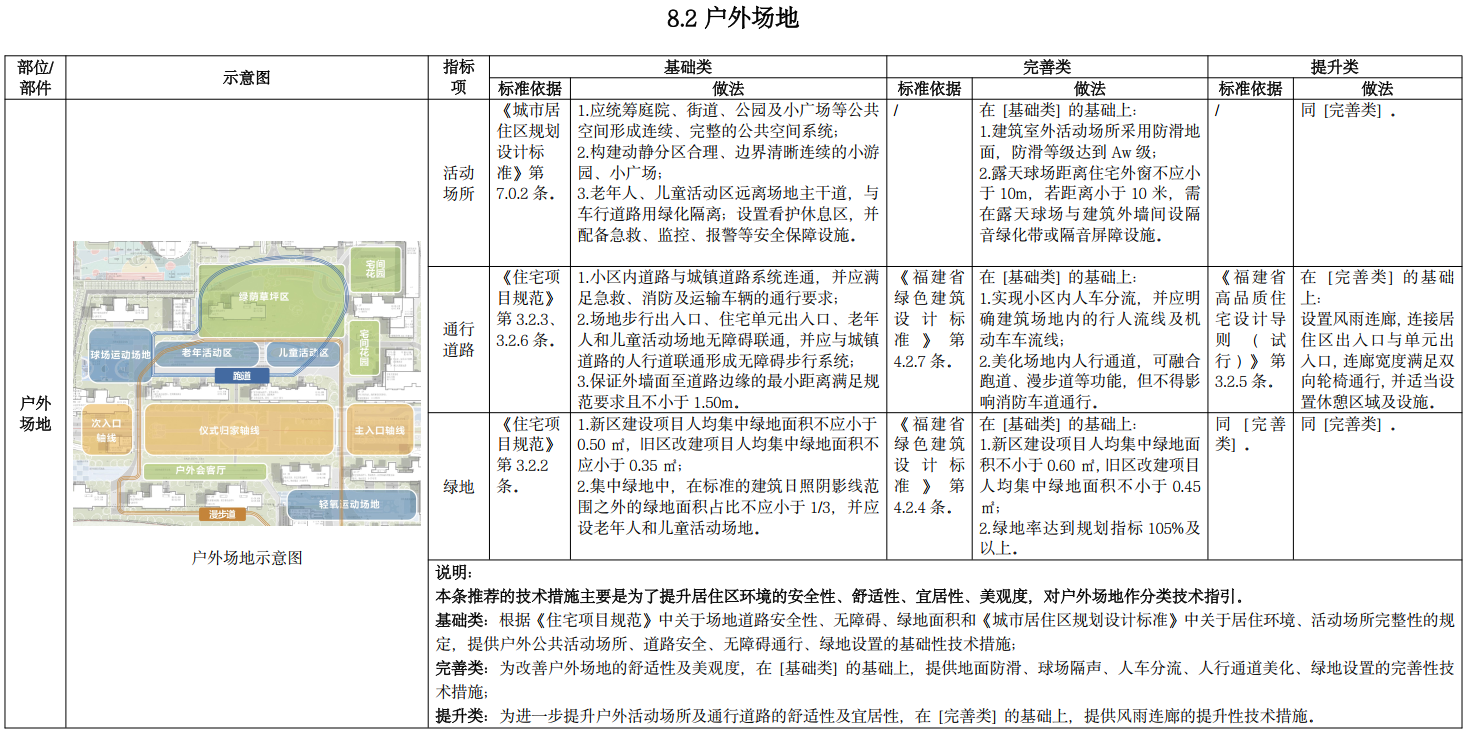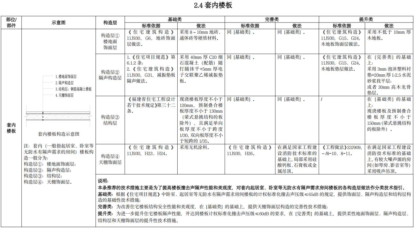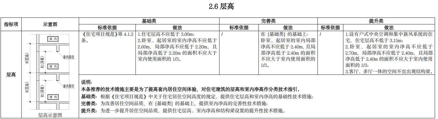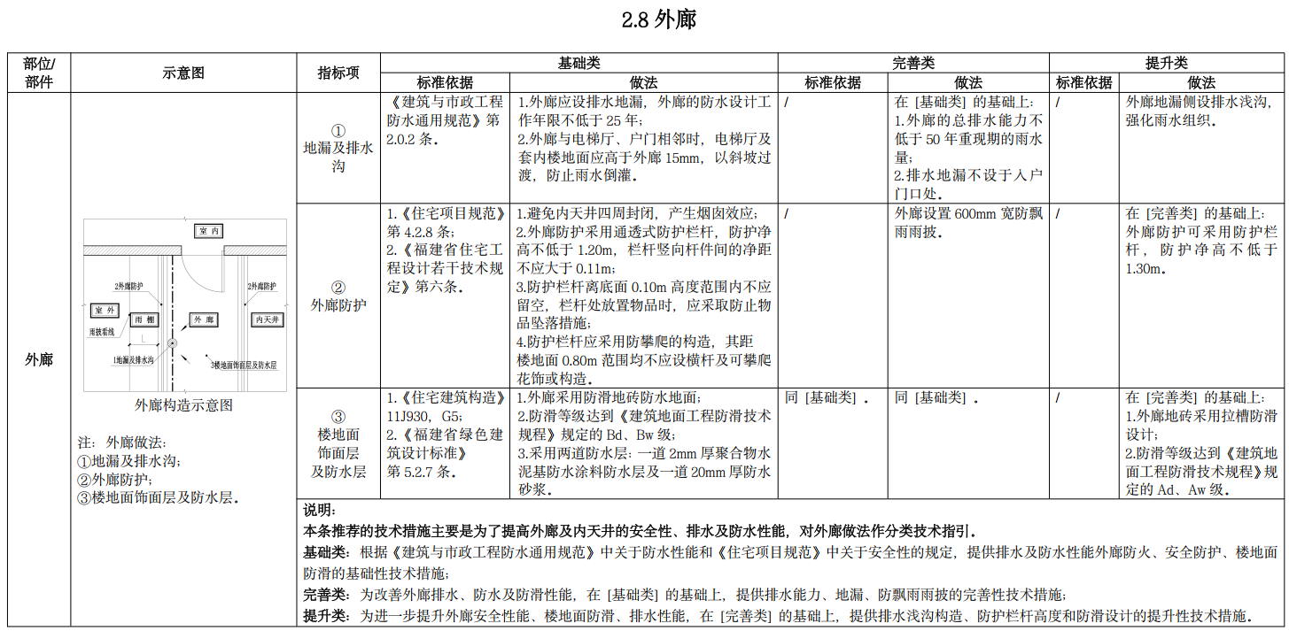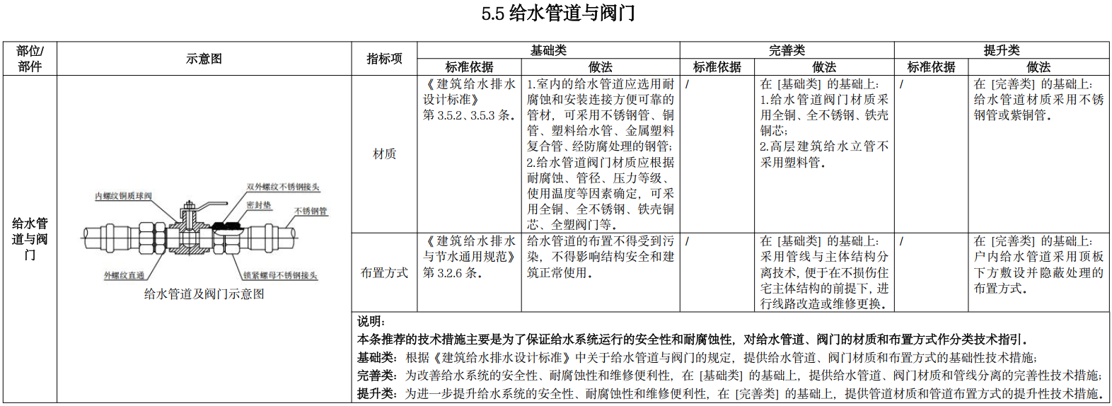 按照住宅设计品质要求分为 “基础类”“完善类”和 “提升类”技术 内容 。其 中 “基础类”为保障住宅 “好房子”品质的基础性技术措施;“完善类”为改善住宅 “好房子”功能