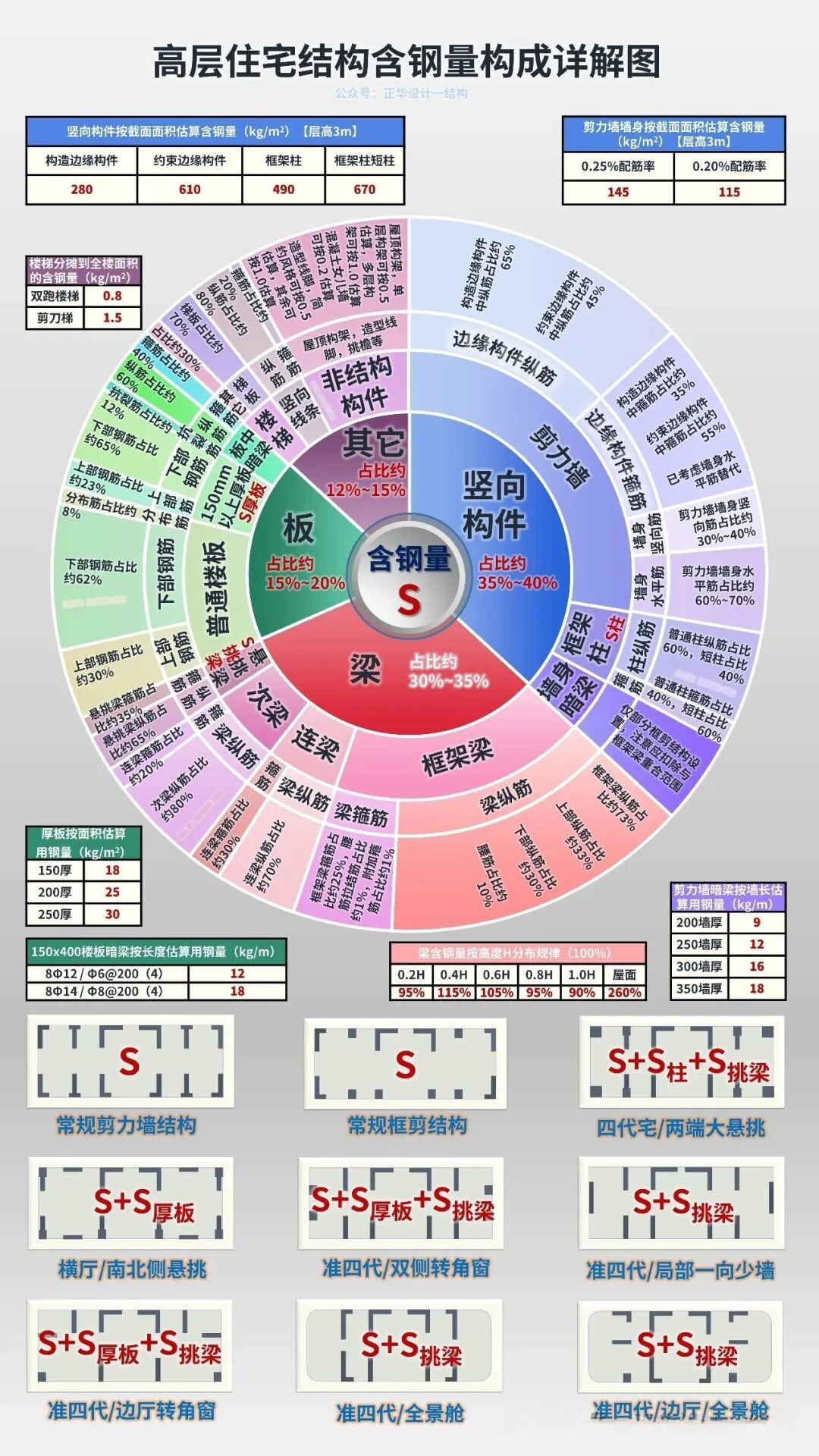 2.影响竖向构件用钢量的主要有两个参数,一个是含墙率(结构墙地比),一个是竖向构件总面积中边缘构件和框架柱所占比例。