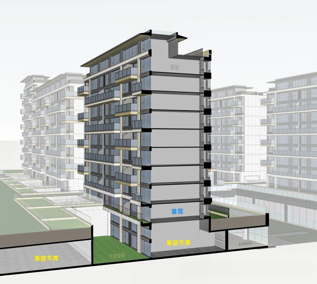 如今在政策支持与成本优势的双重推动下,开发商积极性大大提高。此外,这种地库抬升的设计还能营造出“空中花园”的视觉效果,并带来心理上的优越感。