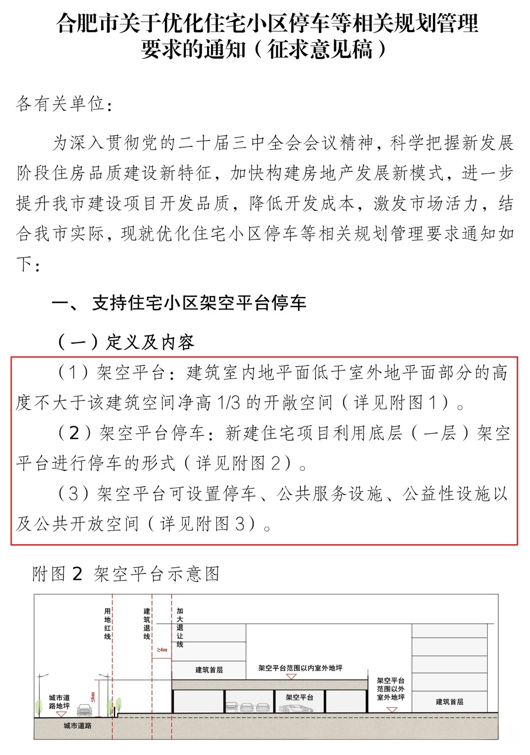 2025年11月,合肥市自然资源和规划局发布公开征求《合肥市关于优化住宅小区停车等相关规划管理要求的通知(征求意见稿)》意见的公告。其中就提到支持住宅小区架空平台停车、允许建设立体停车楼、建筑高度27 米及以下住宅楼允许设置室外专用庭院等。