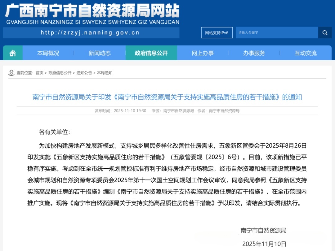 2025年11月,广西南宁市自然资源局网站公示【南宁市自然资源局印发《南宁市自然资源局关于支持实施高品质住房的若干措施》】,从车库到立面,从配套到户型,全面刷新南宁好房子的标准。