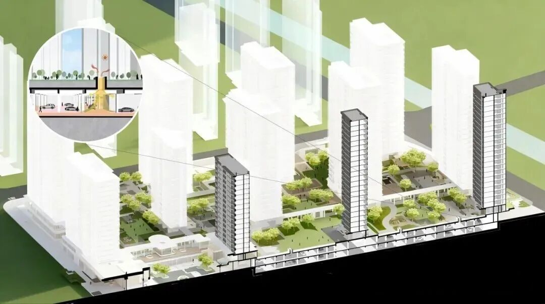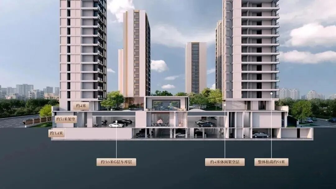 将地下车库抬升至地面,即形成“全架空社区”。以往这类项目较为少见,主要原因在于其会计入容积率。