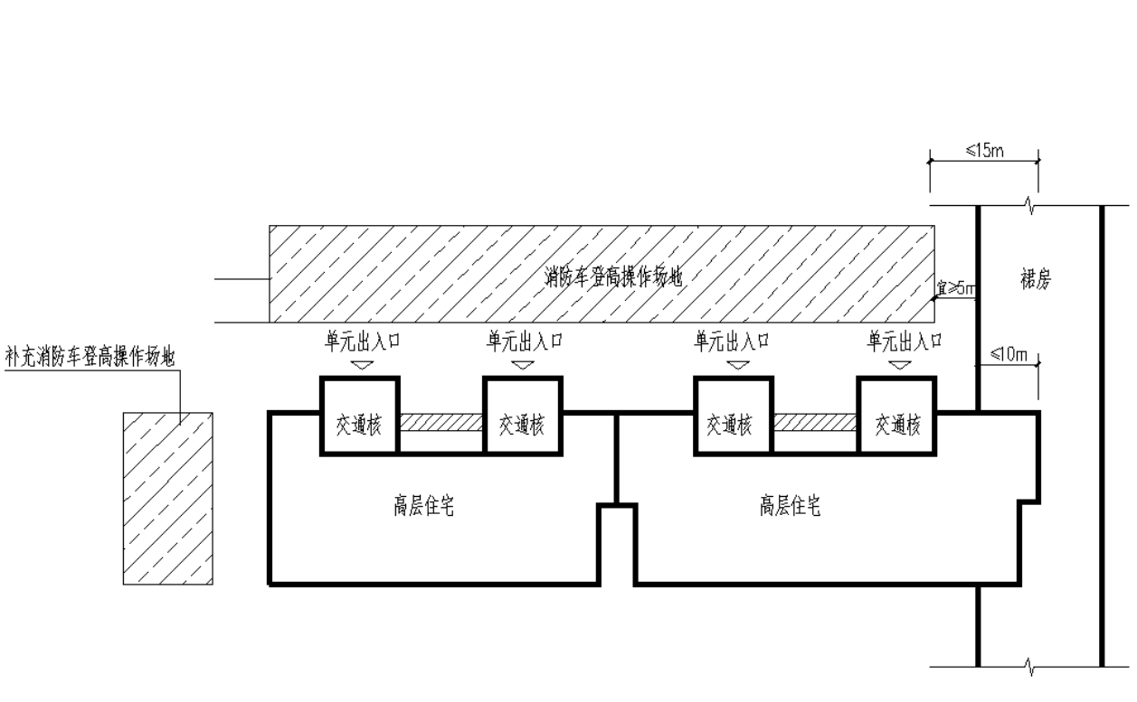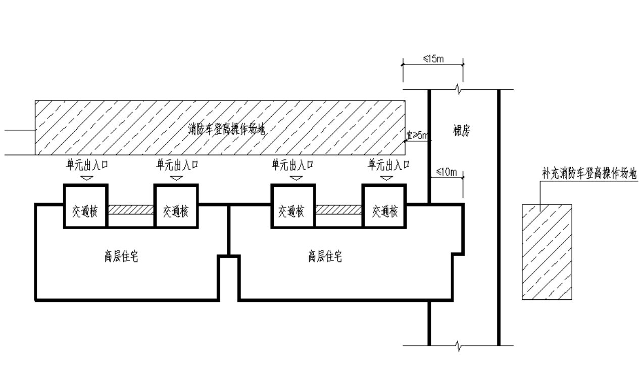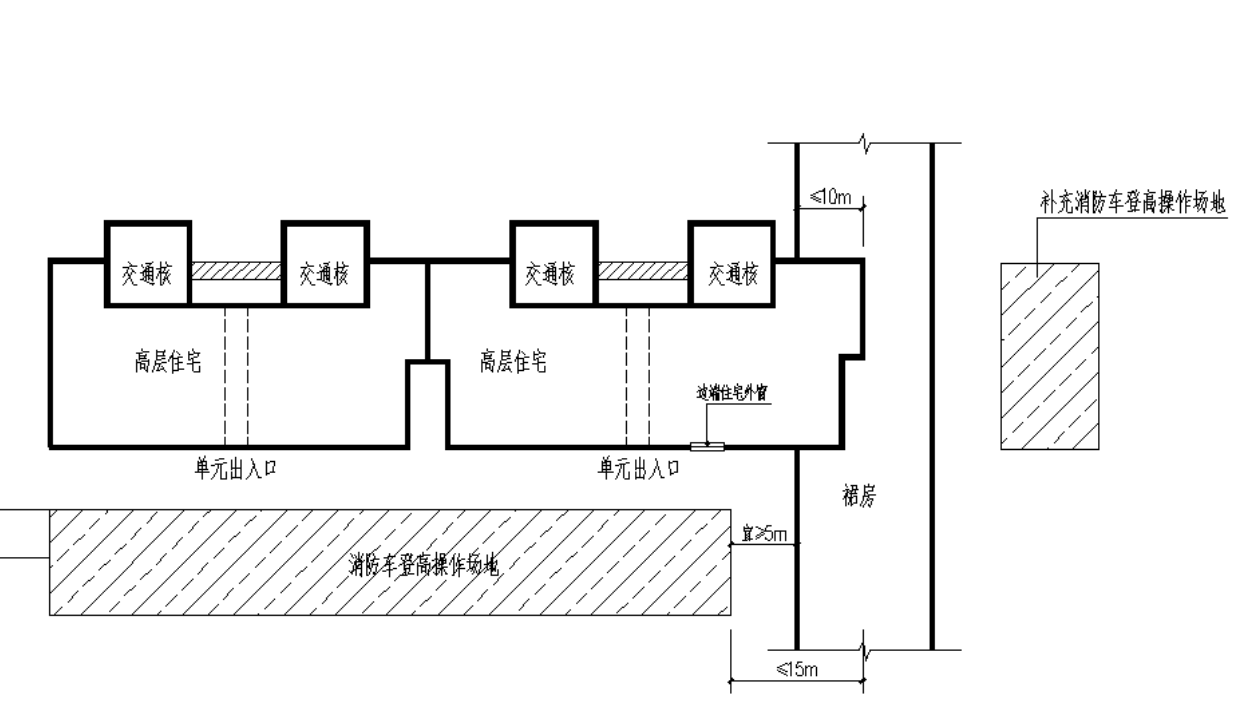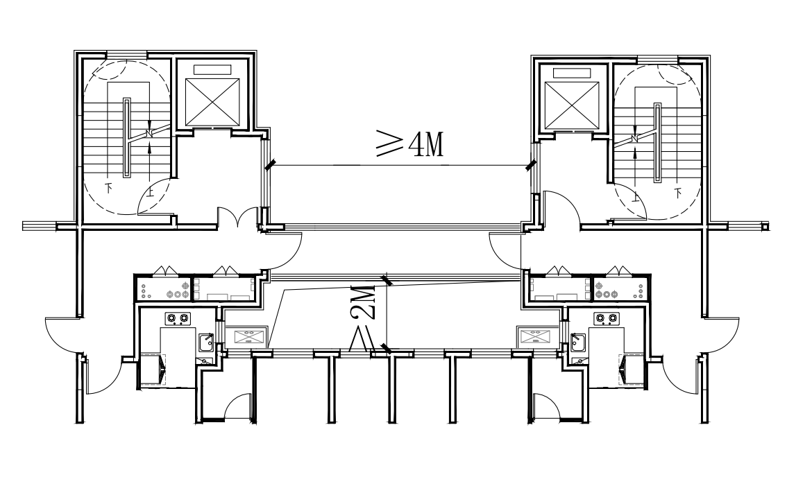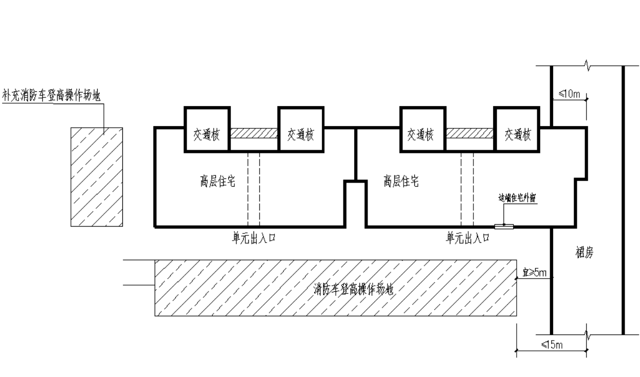2.1.3 住宅楼不同单元之间形成U型空间时,相对外墙上的门、窗、洞口之间距离不应小于6米。当确有困难不满足6米时,应符合以下要求: