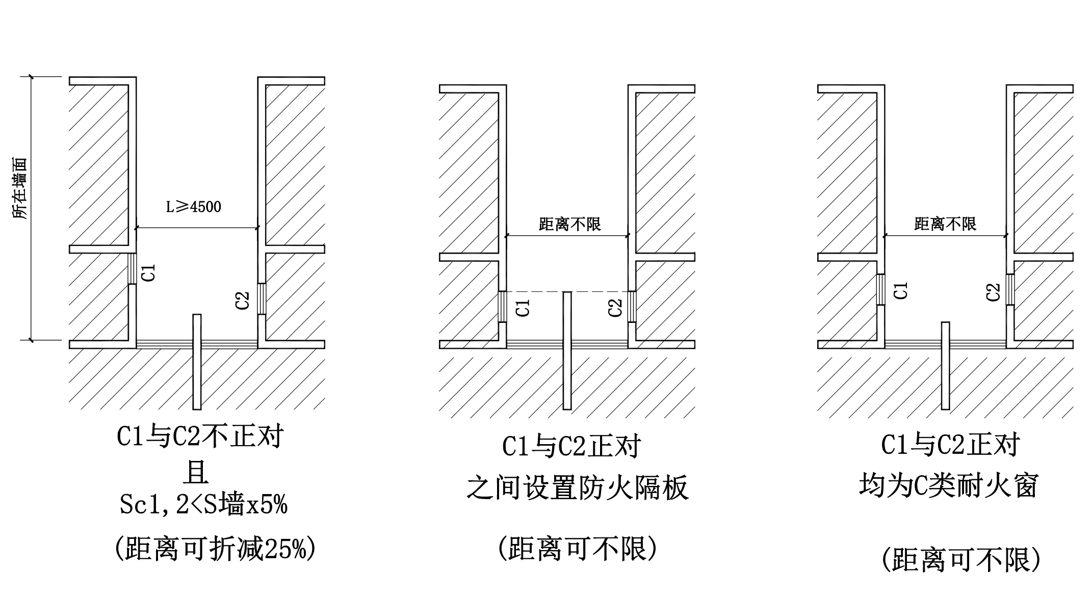 1、相对外墙上的门、窗、洞口不正对开设,且该门、窗、洞口的面积之和不大于其所在墙面面积的5%时,其防火间距可减少25%;